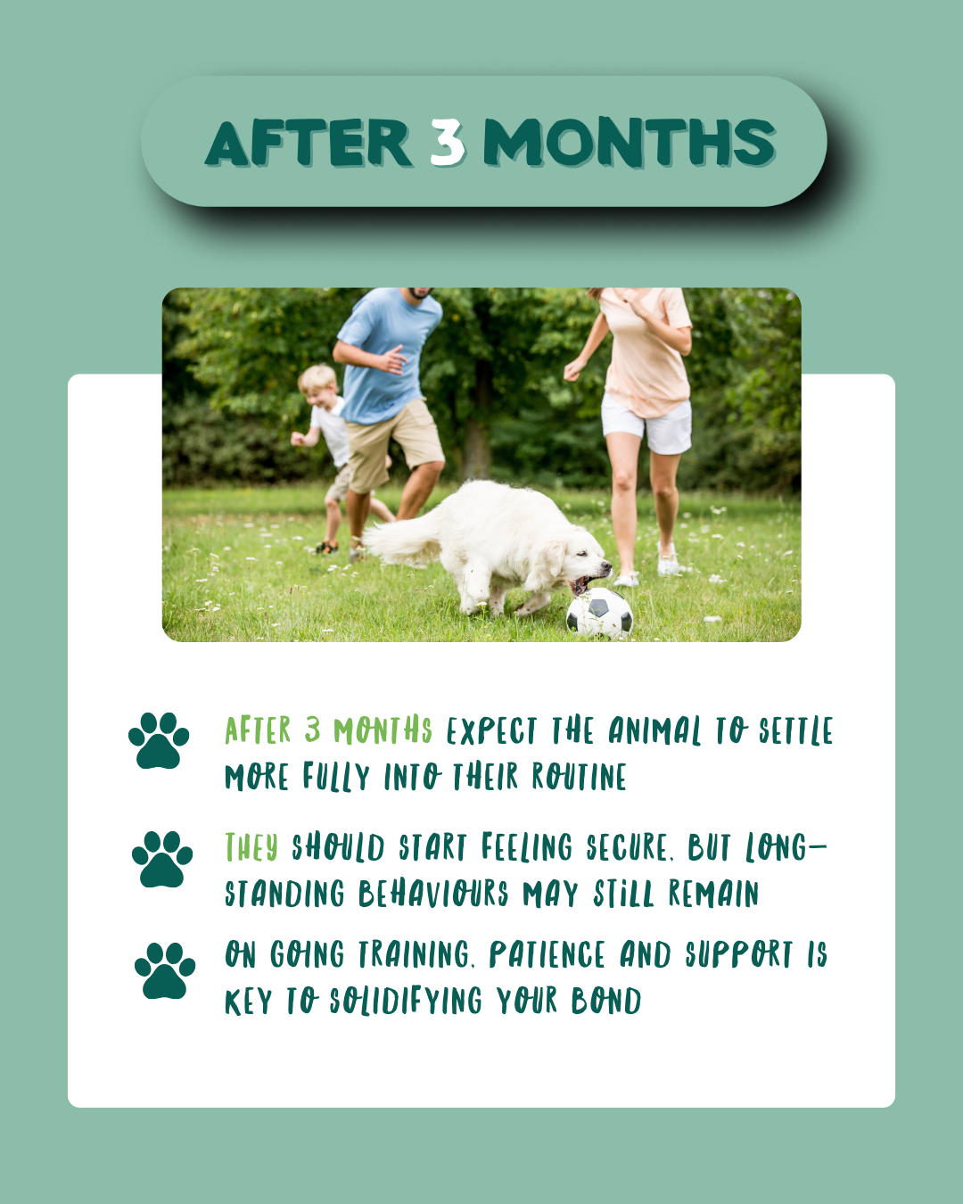 - First 3 months: By this time, the pet should feel like part of the family, having built a bond of trust and fully settled into their new life. This is when training, routines and deep connections solidify.