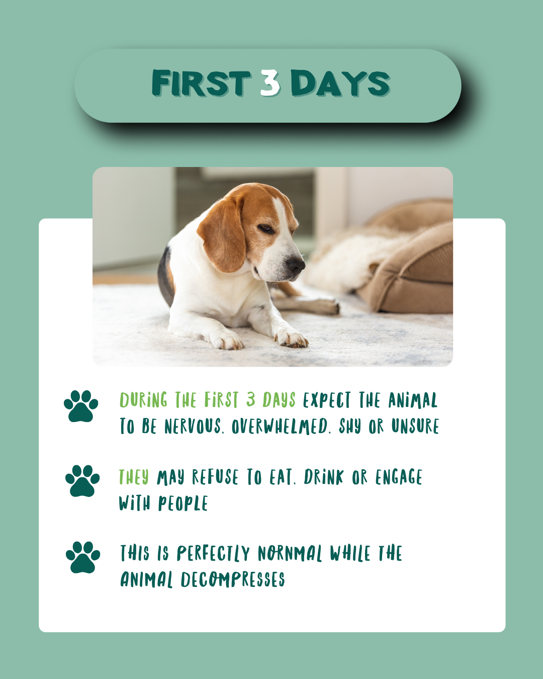 - First 3 days: The animal may feel overwhelmed, anxious, or unsure. Some may hide, refuse food, or struggle to settle. It is essential to give them space, provide a calm environment and establish a routine.