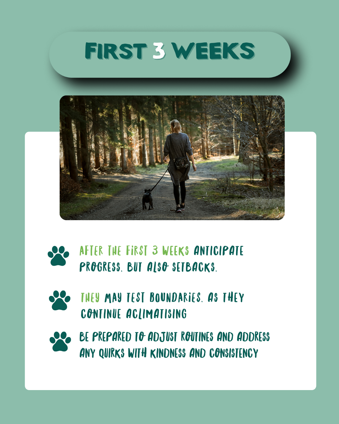 - First 3 weeks: As they begin to feel more comfortable, their true personality will start to emerge. They may test boundaries, explore their surroundings and start forming trust with their new family.